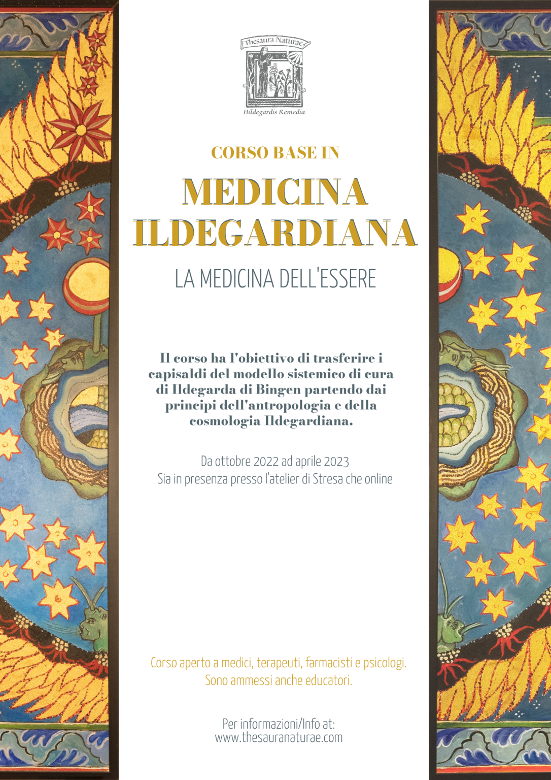 A ottobre 2022 parte la terza edizione del corso base di medicina ildegardiana. Il corso prevede un inquadramento storico e l’analisi del pensiero cosmologico e antropologico ildegardiano quale base imprescindibile per costruire un nuovo modello di cura della malattia cronica. La complessità dei sistemi organismo-ambiente implica necessariamente un altrettanto complessa eziologia della malattia. Il modello ildegardiano parte dalla considerazione che l’uomo ha una natura tridimensionale (corpo, anima e spirito) e la ingloba nelle sue basi epistemiche. Quello ildegardiano è al contempo un metodo di cura e uno stile di vita utile al mantenimento di uno stato di salute duraturo. Durante il corso, saranno trattati temi di antropologia, filosofia scientifica, medicina, storia della medicina, fitoterapia, biofisica, embriologia emozionale, nutrizione, mineralogia, etnomedicina, psicoterapia. Il corso prevederà, infine, l’approfondimento di alcune forme patologiche relative al sistema gastrointestinale, ormonale e immunitario con i relativi approcci terapeutici. Docenti: Dott.ssa Sabrina Melino (Chimica e tecnologa farmaceutica, fitoterapeuta), Dott. Lucio Birello (medico chirurgo e iridologo), Dott.ssa Guarato (biologa nutrizionista), Padre Antonio Gentili (teologo e filosofo, esperto della pratica del digiuno), Dott.ssa Marina Salvi (medico chirurgo, omeopata), Dott. Giorgio Bogni (geologo e gemmologo), Dott. Vincenzo Mazziotta (farmacista, fitoterapeuta).