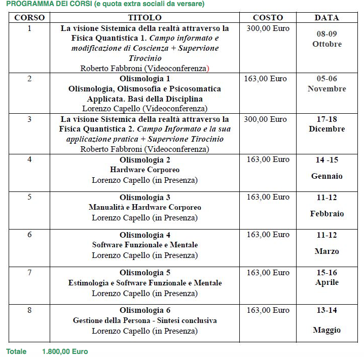 NOTA: Vanno aggiunti tre libri di testo del costo di 130 + Iscrizione a I.B.I., 70 euro all’atto dell’iscrizione associativa e del Master. I corsi sono pagati in anticipo prima dell’usufruizione dello stesso.