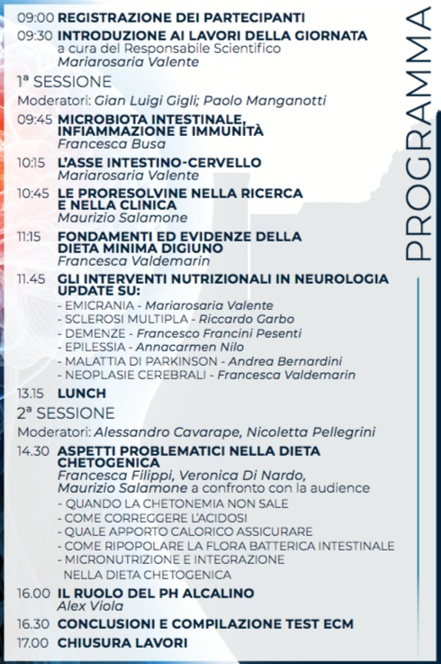 Oltre a fornire ai partecipanti questi elementi conoscitivi di carattere generale, il convegno si propone di affrontare in dettaglio alcuni approcci dietetici come la dieta minima digiuno, la dieta chetogenica e il ruolo degli integratori nel controllo della infiammazione e dei processi degenerativi.