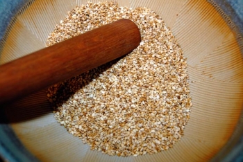 – Quando schiacciate nel mortaio ("suribachi", nella versione giapponese) non è necessario ridurre in polvere, bisogna solo rompere tutti i semini. Questa miscela si usa come sale culinario, da mettere sui cibi.