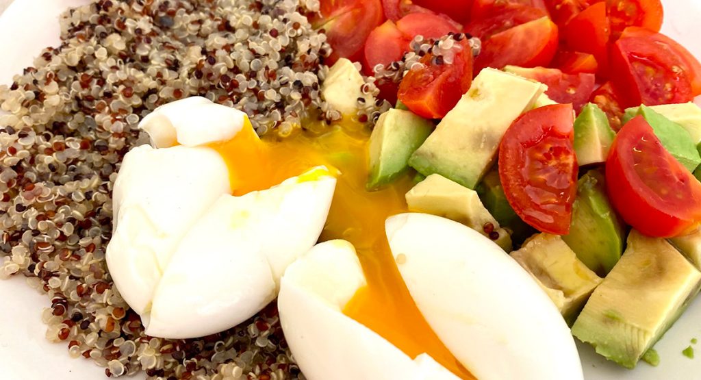 In un piatto versa la quinoa aggiungi le due uova, le fette di avocado e i pomodorini.