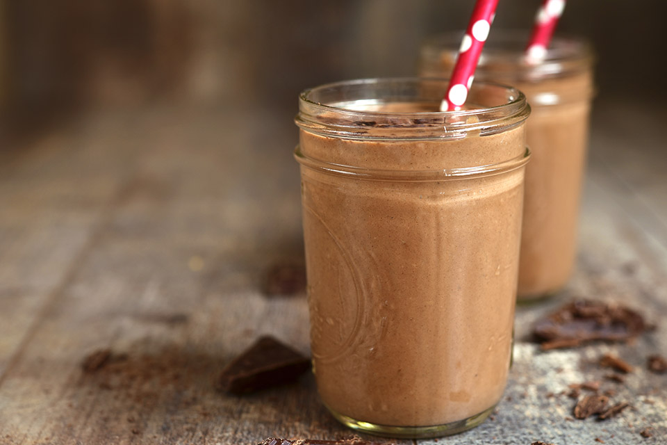 Versate il latte di mandorla con il cioccolato, i cubetti di ghiaccio e i pezzi di frutta nel bicchiere del frullatore. Frullate fino a che il composto diventa spumoso.