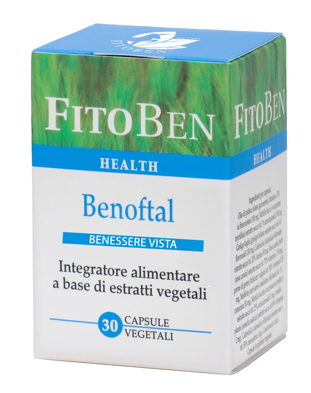 Benoftal (30 capsule vegetali) è un integratore naturale studiato e formulato per migliorare l’acutezza visiva e proteggere i tessuti oculari dai danni dell’invecchiamento e dallo stress ossidativo, anche quello dovuto a una continua esposizione alla luce blu degli schermi del computer e della televisione. Benoftal previene le degenerazioni che possono causare cataratta, maculopatia e peggioramento della visione con scarsa luminosità. Come sempre quando si formula un integratore Fitoben, le piante contenute sono scelte per dare un’azione completa e bilanciata all’integratore stesso. Il Mirtillo nero migliora l’acutezza visiva e la visione notturna in quanto facilita la rigenerazione della rodopsina e la protezione dei capillari della retina. Ginkgo biloba migliora il flusso del sangue agli occhi e combatte i danni dei radicali liberi che possono deteriorare la cornea, la macula e la retina. Luteina e Zeaxantina, pigmenti oculari che derivano dalla calendula, appartengono alla famiglia dei carotenoidi e proteggono dall’insorgenza di degenerazioni visive, quali la cataratta e la degenerazione maculare. Vitamina A come betacarotene per la rigenerazione della rodopsina, responsabile della visione crepuscolare; Vitamina C e Vitamina E per la loro azione antiossidante e per proteggere i fotorecettori della retina dai radicali liberi; Vitamina B2 per mantenere la capacità visiva. Non meno importanti per la composizione del prodotto, ricordiamo il Meliloto, per aumentare la resistenza dei capillari e per un’azione antinfiammatoria, e la Centella asiatica, per rinforzare le fibre connettive e aiutare la formazione delle fibre di collagene. Se si assumono farmaci anticoagulanti e antiaggreganti piastrinici, consultare il medico prima di prendere il prodotto. Sconsigliato in gravidanza e allattamento. www.fitoben.com