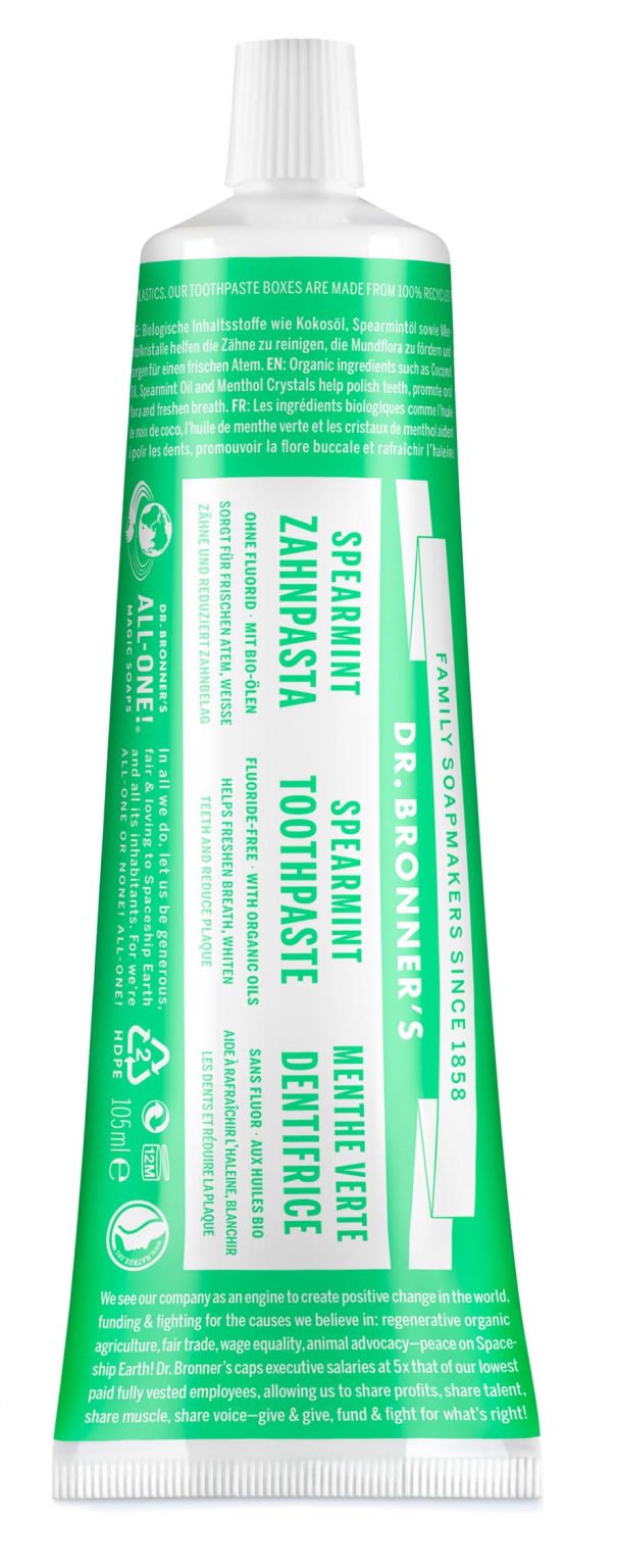 Realizzato con il 70% di ingredienti biologici, grazie alla farina e all’olio di cocco biologici, deterge delicatamente ed efficacemente aiutando a lenire le gengive grazie alle proprietà dell’aloe biologica. La silice idrata e il carbonato di calcio agiscono come abrasivi naturali, il succo di aloe biologico aiuta a lenire le gengive, mentre l’olio di menta verde e i cristalli di mentolo biologici donano un rinfrescante sapore di menta. È un prodotto adatto anche ai vegani, non contiene fluoro, carregenina, coloranti artificiali, aromi o agenti detergenti schiumogeni sintetici. È certificato non OGM, Natrue e Vegan. Disponibile anche al gusto Menta Piperita, il dentifricio di Dr. Bronner’s è confezionato in scatola e tubo riciclabili al 100%. I prodotti Dr. Bronner’s sono disponibili in farmacia e in erboristeria, oppure su macrolibrarsi.it, su H&M Beauty e nell’area Green dei punti vendita COIN di Roma Cinecittà, Torino Lingotto e Verona. Dr. Bronner’s è il marchio naturale di sapone più venduto in America, conosciuto per i suoi prodotti per la cura della persona realizzati con ingredienti certificati bio e provenienti da commercio equo e solidale (confezione da 105 g, 8,90 euro).