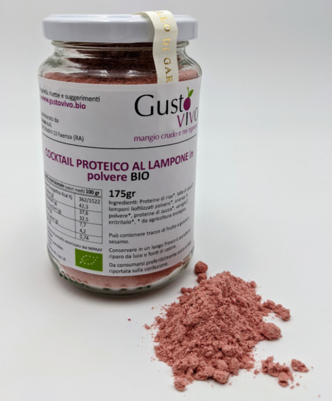 Ultima novità creata nel laboratorio di Gustovivo, un Cocktail proteico al Lampone, dal gusto fresco e aromatico, buono e profumato, completo, gluten free, privo di lattosio, con ingredienti bio e raw, non sottoposti a temperature oltre i 42 gradi e con un apporto proteico di circa 43%. Al suo interno troviamo le proteine del riso, le proteine di semi di zucca, il latte di cocco in polvere, il lampone in polvere, l’ananas in polvere, la vaniglia e un po’ di eritritolo per arrotondare la formula. Le proteine vegetali possono essere inserite nelle nostre giornate e rappresentano una soluzione molto versatile per arricchire le nostre colazioni e anche i frullati, prima dell’esercizio fisico e subito dopo per supplementare il fab- bisogno proteico, come sostitutivo di un pasto, se inserite in un piano alimentare bilanciato. Le Proteine Vegetali hanno proprietà funzionali e nutrizionali importanti, permettono di reintegrare gli aminoacidi liberi; contengono fibre, enzimi, omega, minerali e vi- tamine; sono povere di grassi e hanno un potere alcalinizzante formidabile, al contrario delle proteine animali. Il costo del coc- ktail 175g è di 19,80 euro.