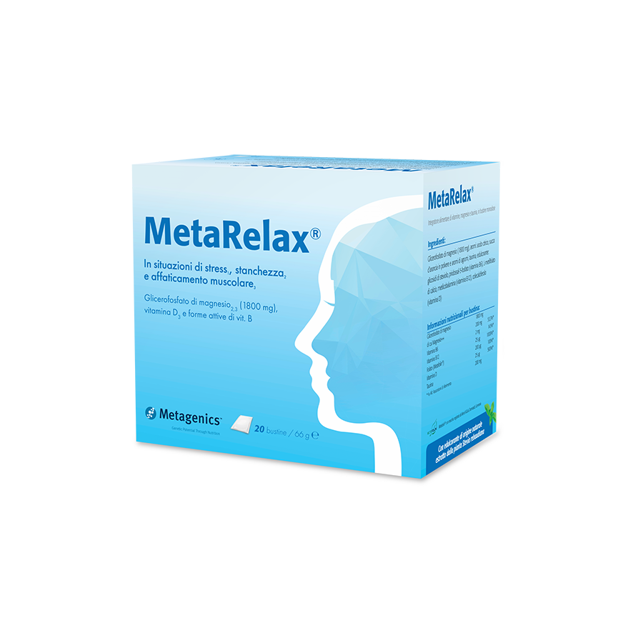 MetaRelax contiene glicerofosfato di magnesio,una forma di magnesio di alta qualità, molto ben assorbito da parte dell’organismo e perfettamente tollerato dall’apparato gastrointestinale. Contiene inoltre vitamine B in forma attiva, immediatamente disponibili per agire nell’organismo senza bisogno di subire ulteriori trasformazioni, taurina e vitamina D. Disponibile in bustine al delizioso gusto lime e in compresse. Scopri di più su www.metarelax.it