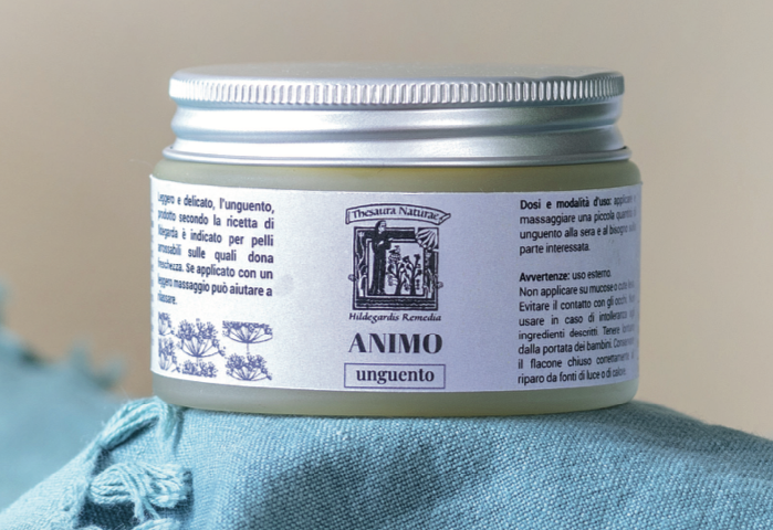 Leggero e delicato, L’unguento Animo, prodotto secondo la ricetta di Ildegarda, è indicato per pelli soggette all’arrossamento alle quali dona freschezza. Grazie all’azione degli oli essenziali e dei principi attivi contenuti nell’achillea, nella salvia, nel finocchio, estratti di olio di jojoba, esplica una particolare attività rilassante e contrastante delle tensioni emotive. Ildegarda suggerisce di applicarlo sulle tempie, sulla nuca e sul cuore al bisogno e prima di coricarsi. Concilia il sonno e, durante il giorno, allevia lo stress da prestazione. Prezzo 23 euro (50 ml).